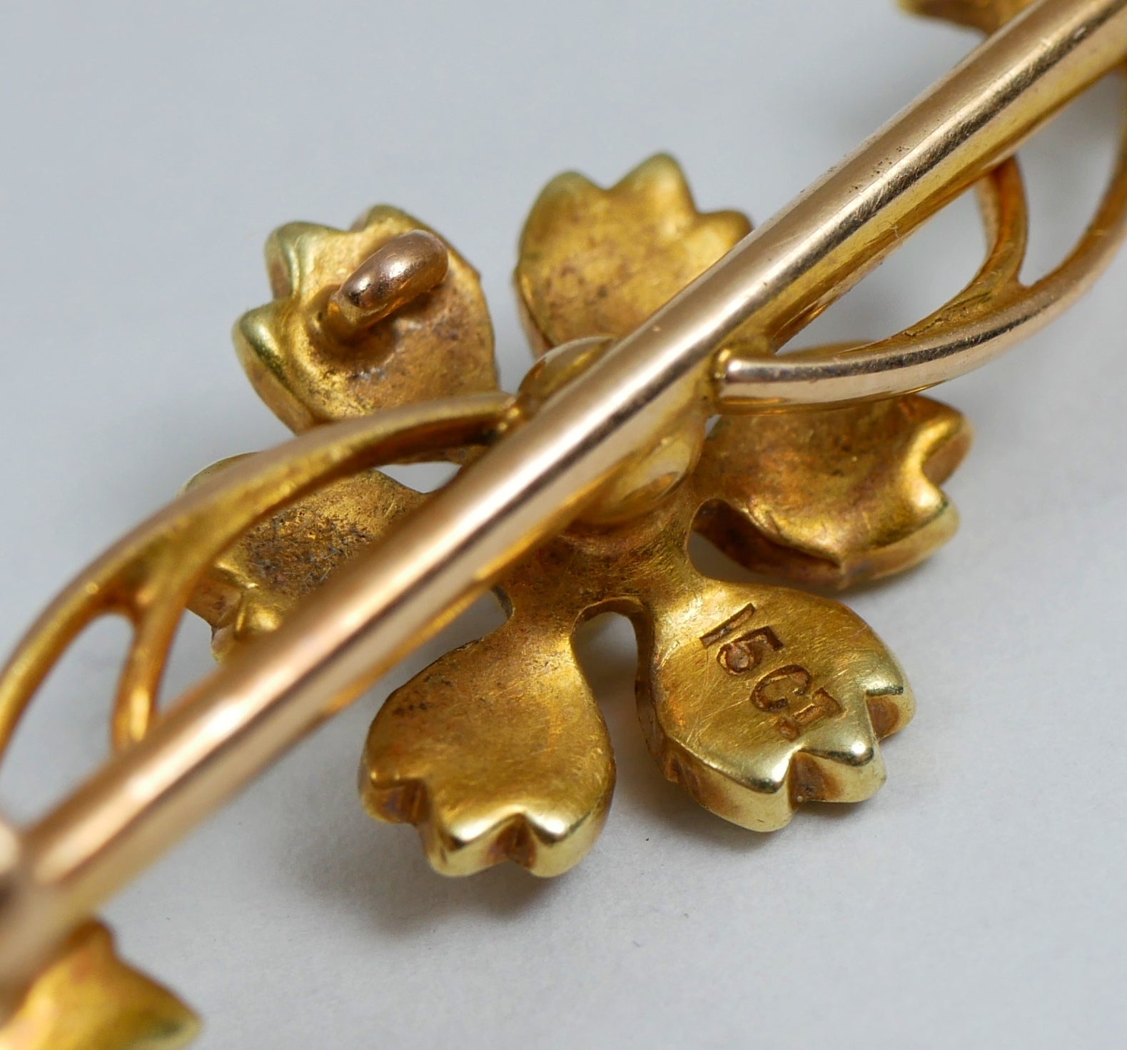 Here today for your consideration we have this sweet Art Deco solid 15ct yellow gold brooch, featuring a total of thirteen (13) seed pearls in a flower and twin leaf setting against a single bar, c-1925. The brooch is of petite proportion, being of very good quality throughout. Condition is good used, with no major damage to note. The metal pin holds good tension within the catch, with the pearls of good quality and lustre. A fine example of an early 20th century solid gold brooch for the collection.
