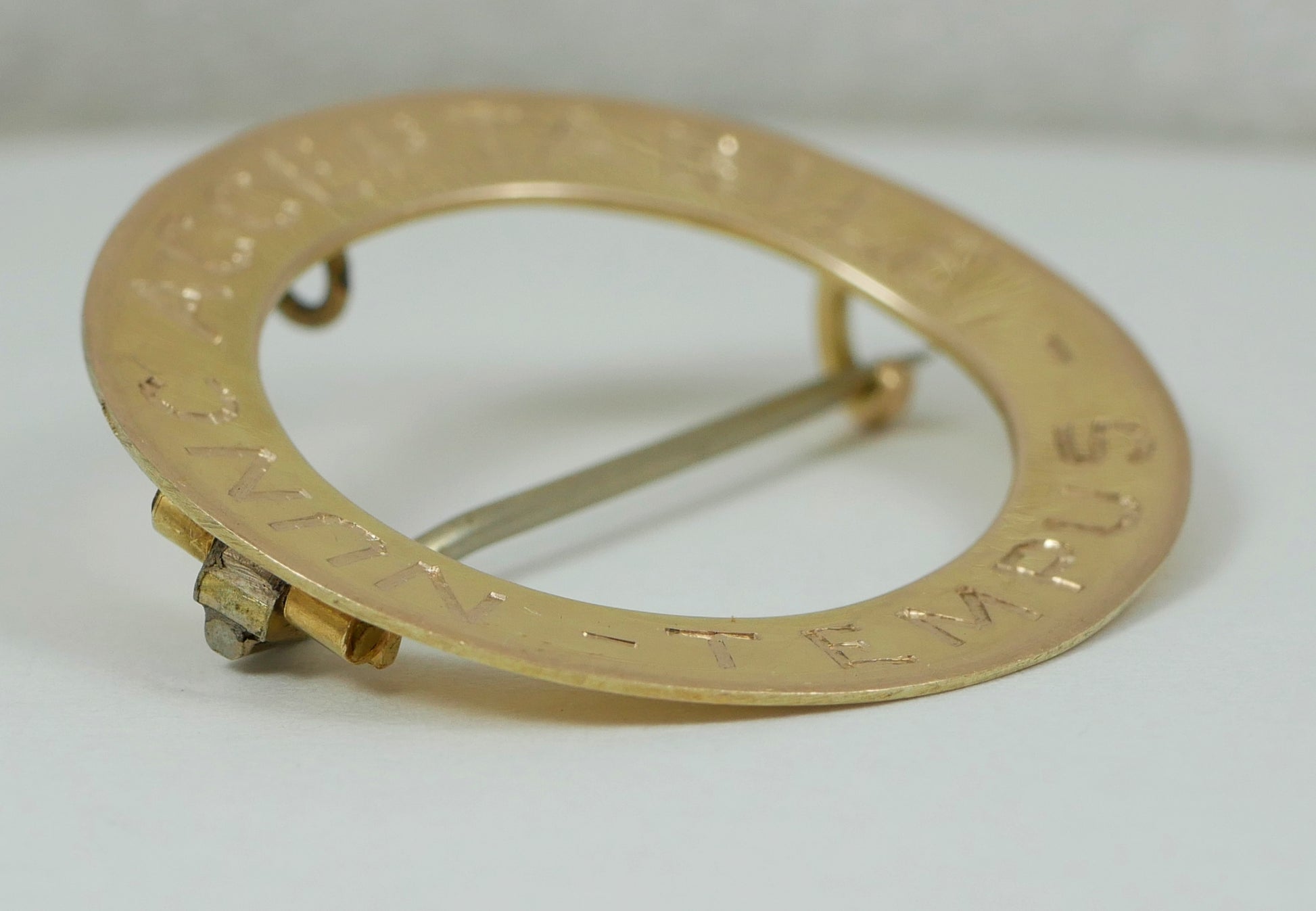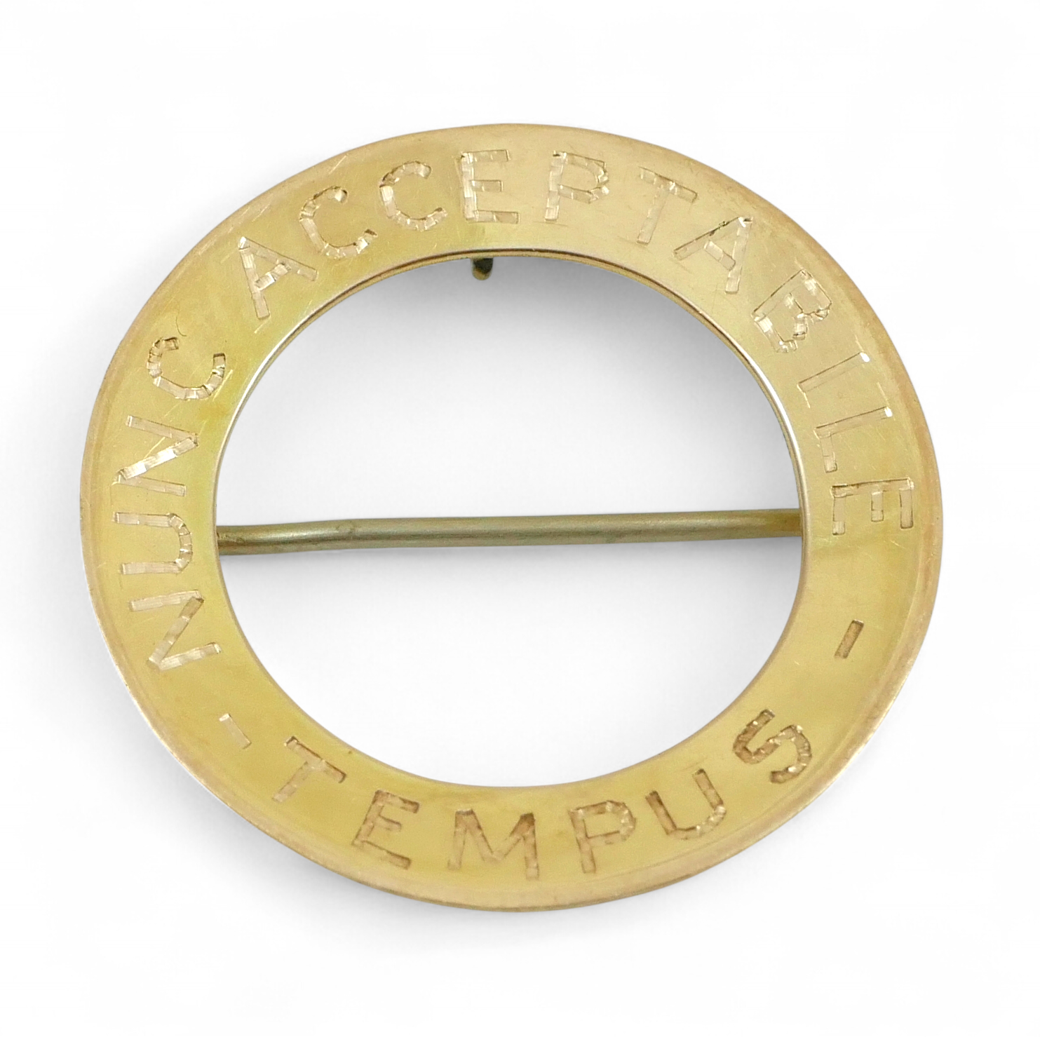 Here today for your consideration we have this beautiful Edwardian solid 9ct yellow gold brooch, being of voided disc shape, c-1910. The brooch features the Latin inscription "Nunc Acceptabile Tempus" which translates to "now is an acceptable time", being of good quality throughout. Condition is good used, with no major damage to note. The pin holds good tension within the catch, with provision for a safety chain or bail to the centre top. A fine example of an early 20th century solid gold brooch for the collection.