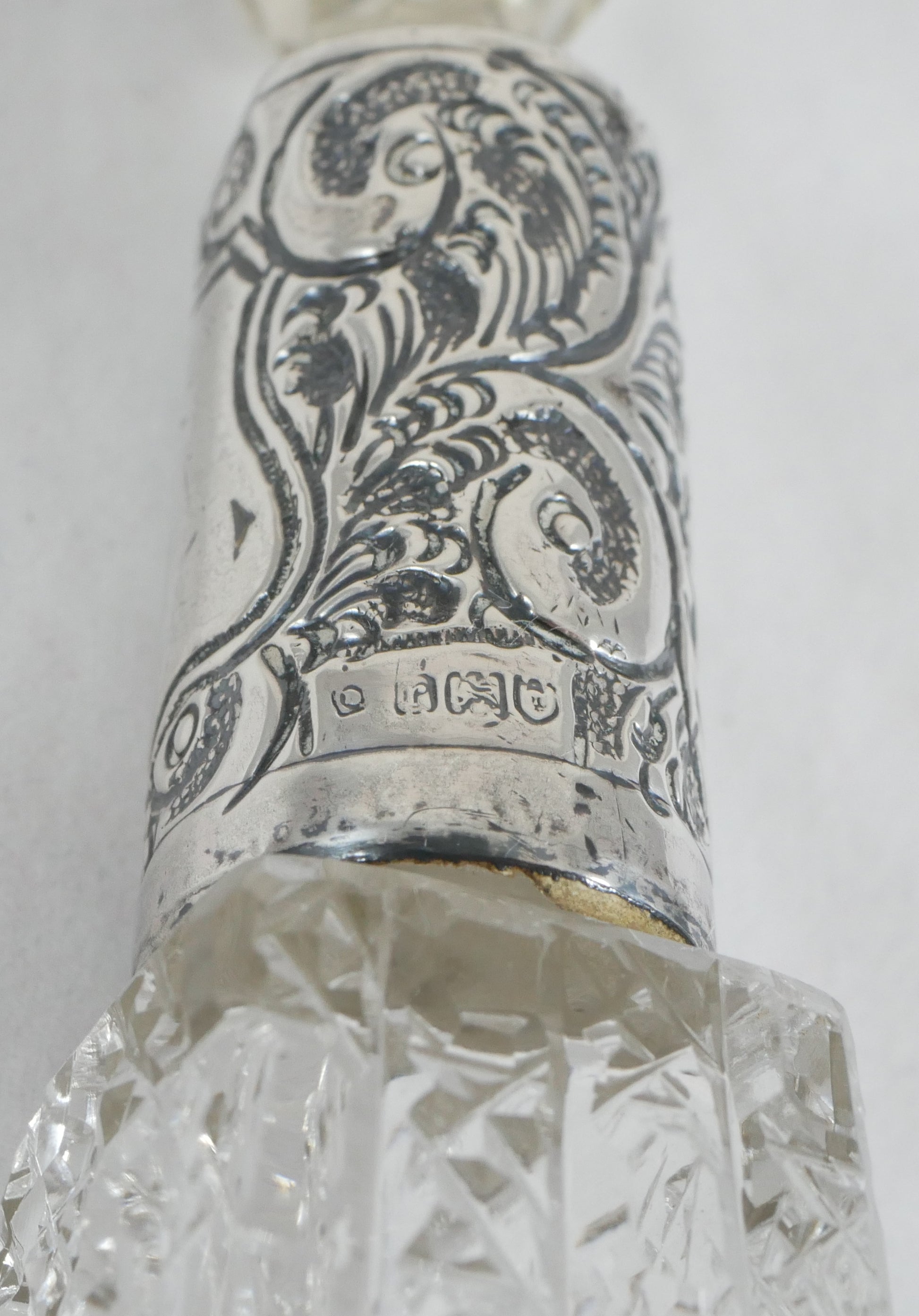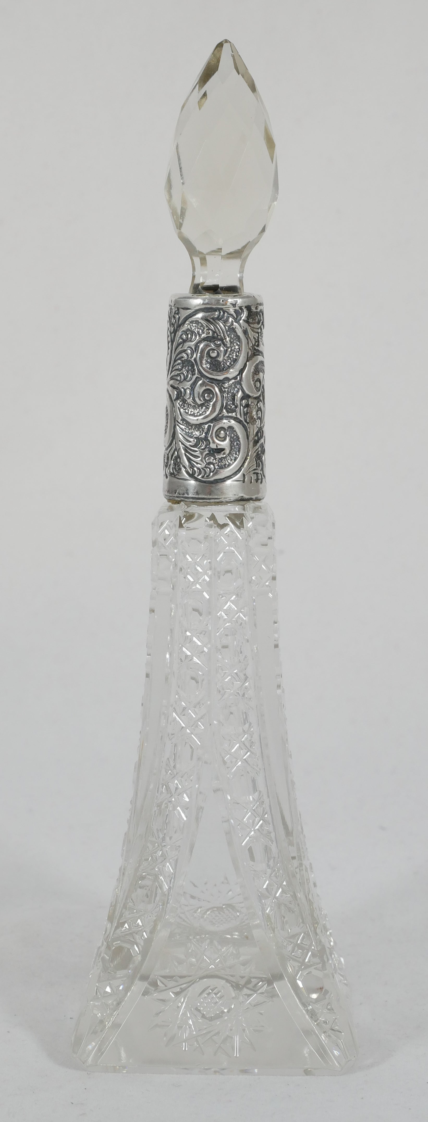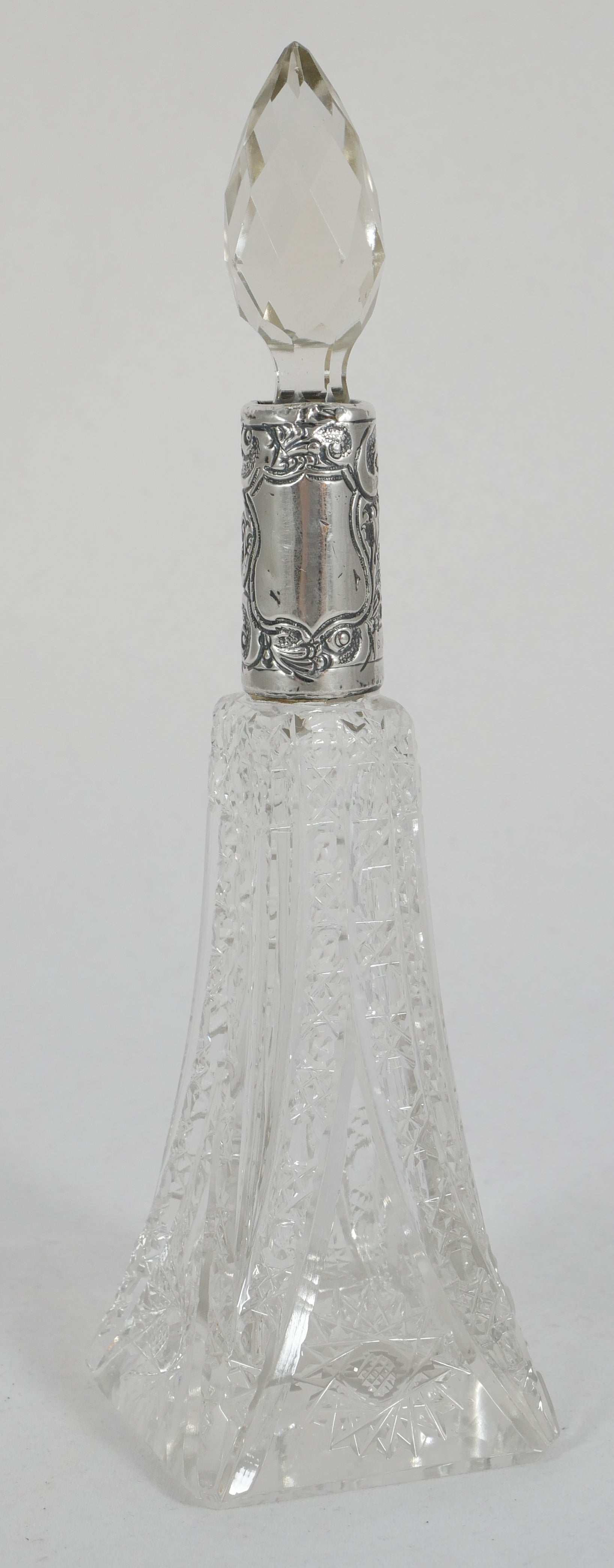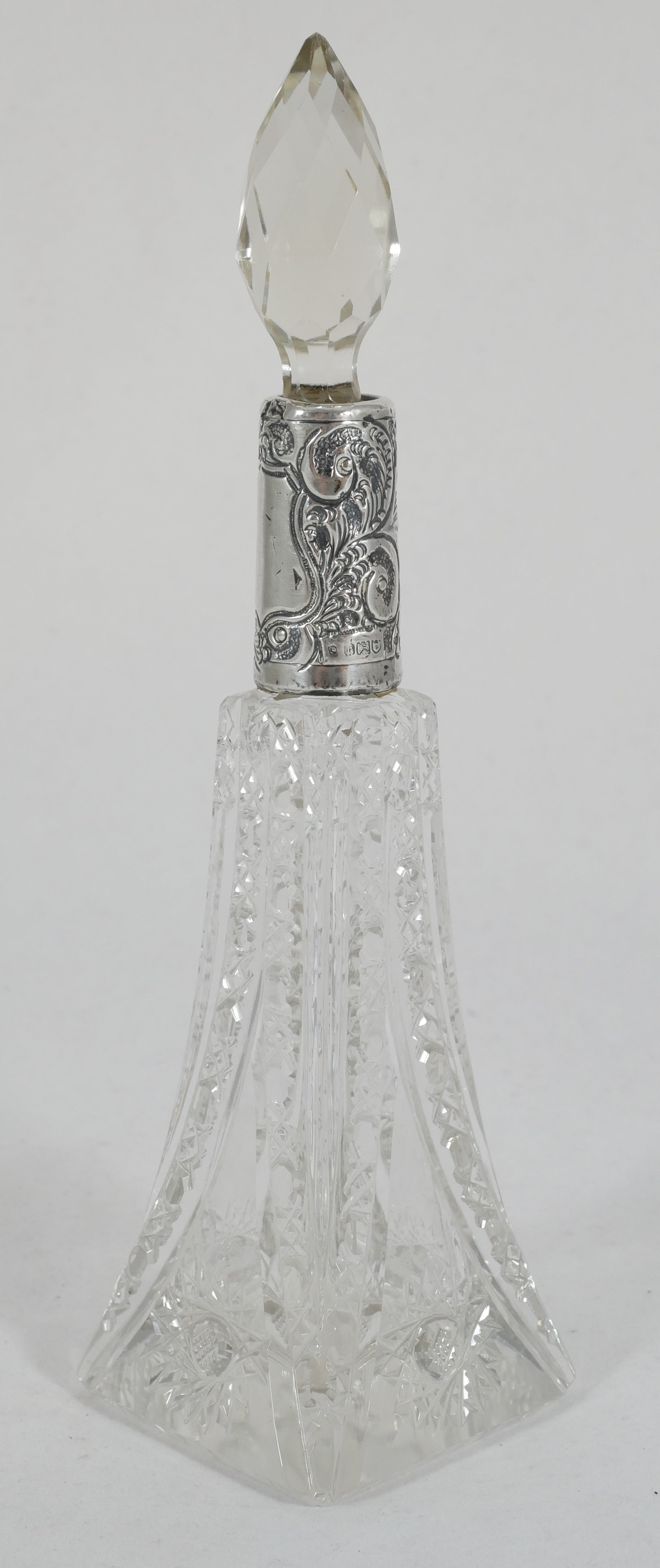 Here today for your consideration we have this beautiful Edwardian tapering glass perfume bottle, featuring sterling silver collar made in London, c-1912. The bottle is of wheel-cut design with faceted stopper and repousse detail to the silver collar with shield-shape cartouche. Condition is good used, with no major damage to note (a few minor depressions to the silver evident and a few fleabites to the glass in places, nothing too serious). The bottle is free from monogram or crest, with the hallmarks about 60% overall (maker illegible). A delightful early 20th century sterling silver-mounted perfume bottle for the collection.