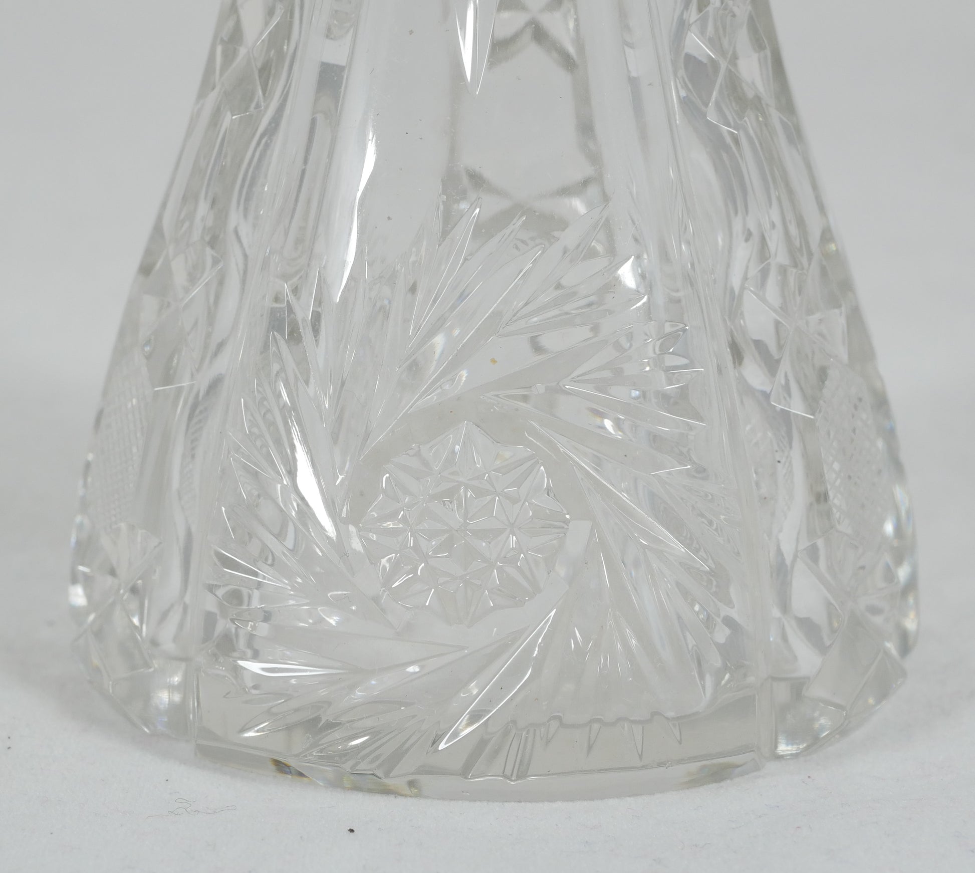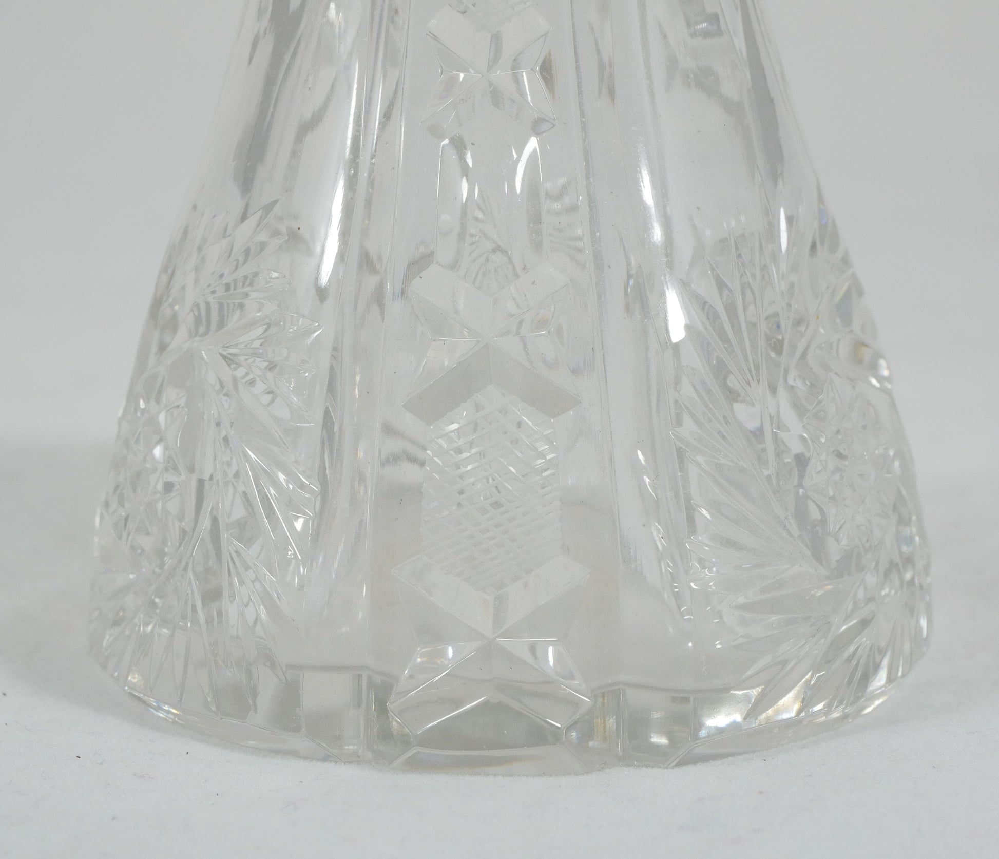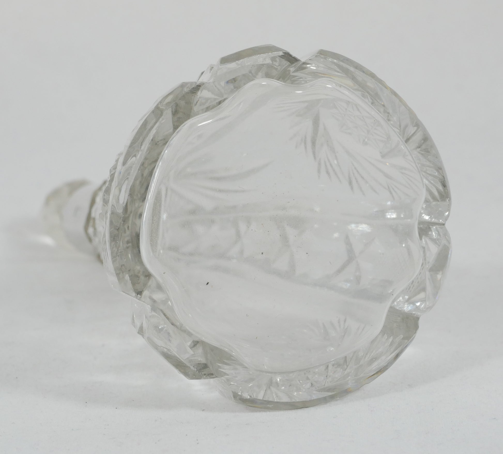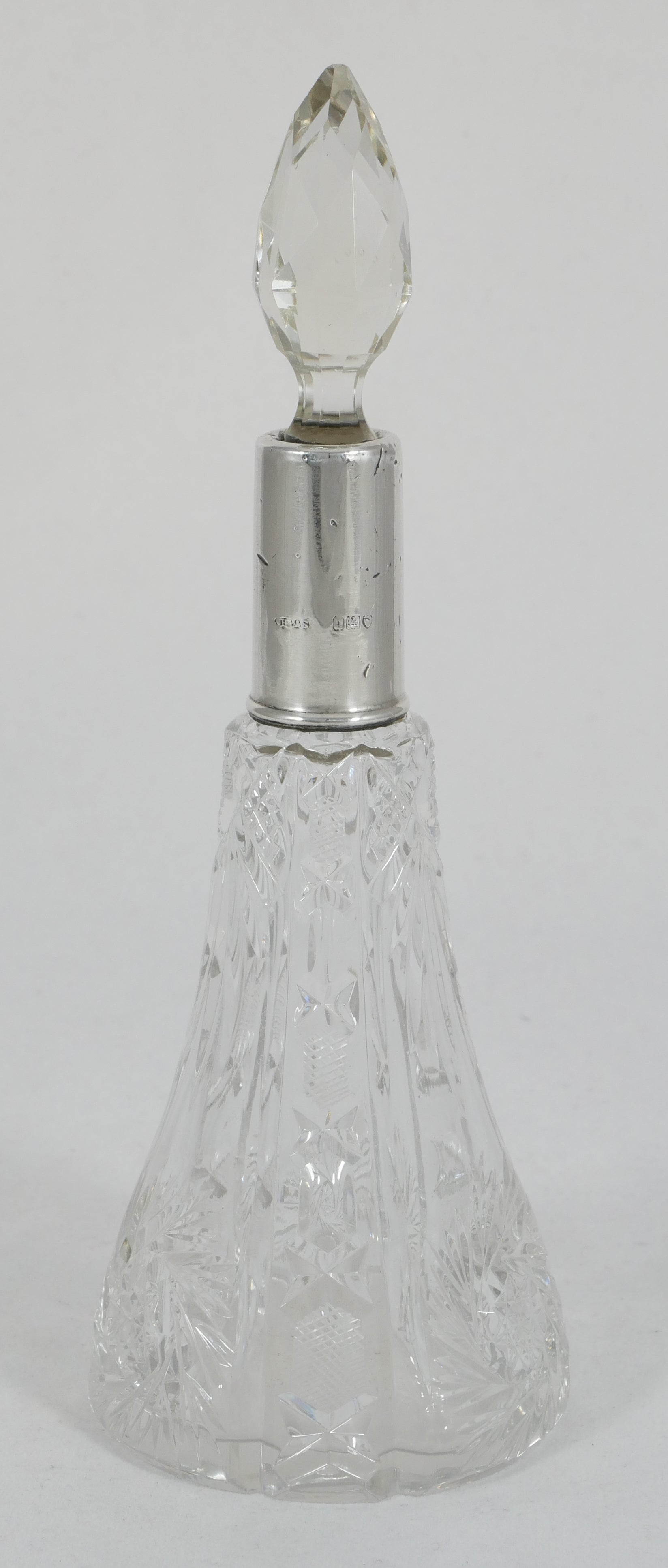 Here today for your consideration we have this beautiful Edwardian tapering glass perfume bottle, featuring sterling silver collar made by Henry Perkins & Sons of London, c-1915. The bottle is of wheel-cut design with faceted stopper and plain silver collar. Condition is reasonably good used, with the stopper being chipped at the base as well as a few minor depressions to the silver evident and a few fleabites to the bottle in places, (nothing too serious). The bottle is free from monogram or crest, with the hallmarks about 60% overall (fading). A delightful early 20th century sterling silver-mounted perfume bottle for the collection.