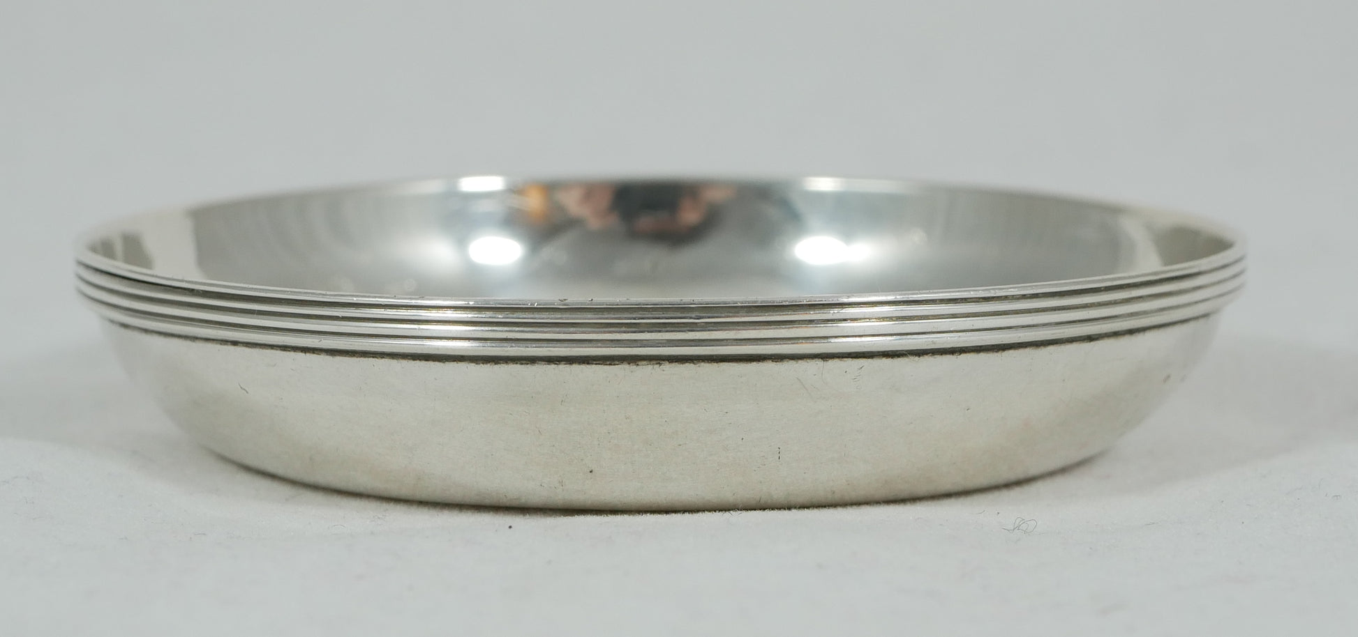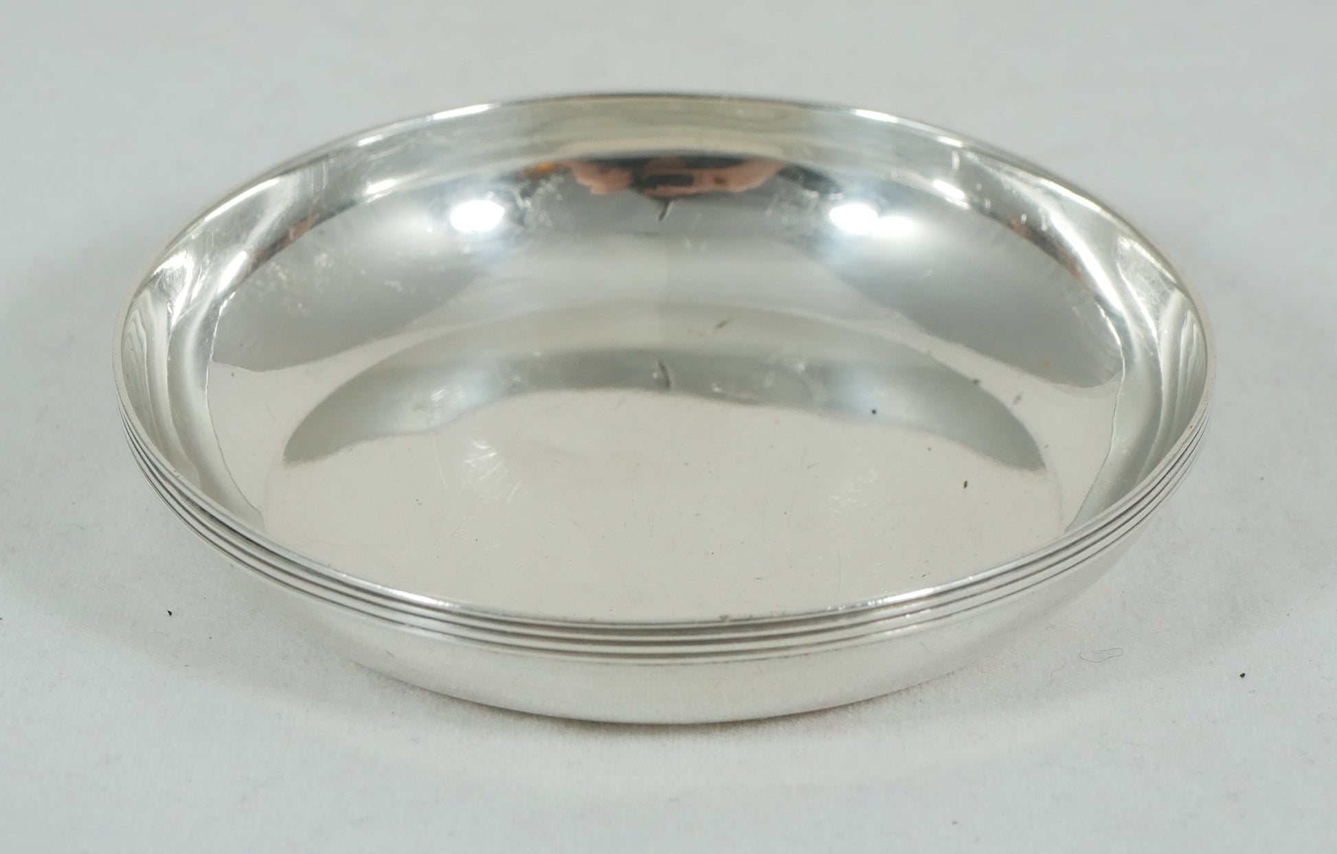 Here today for your consideration we have this sweet late Edwardian sterling silver small dish, made in London, c-1920. The dish is of flat base design with reeded rim, being of good quality and gauge throughout. Condition is good used, with a few depressions to the base evident. The plate is free from monogram or crest, with the hallmarks about 70% overall (maker illegible; all but worn). A versatile solid silver dish for the table.