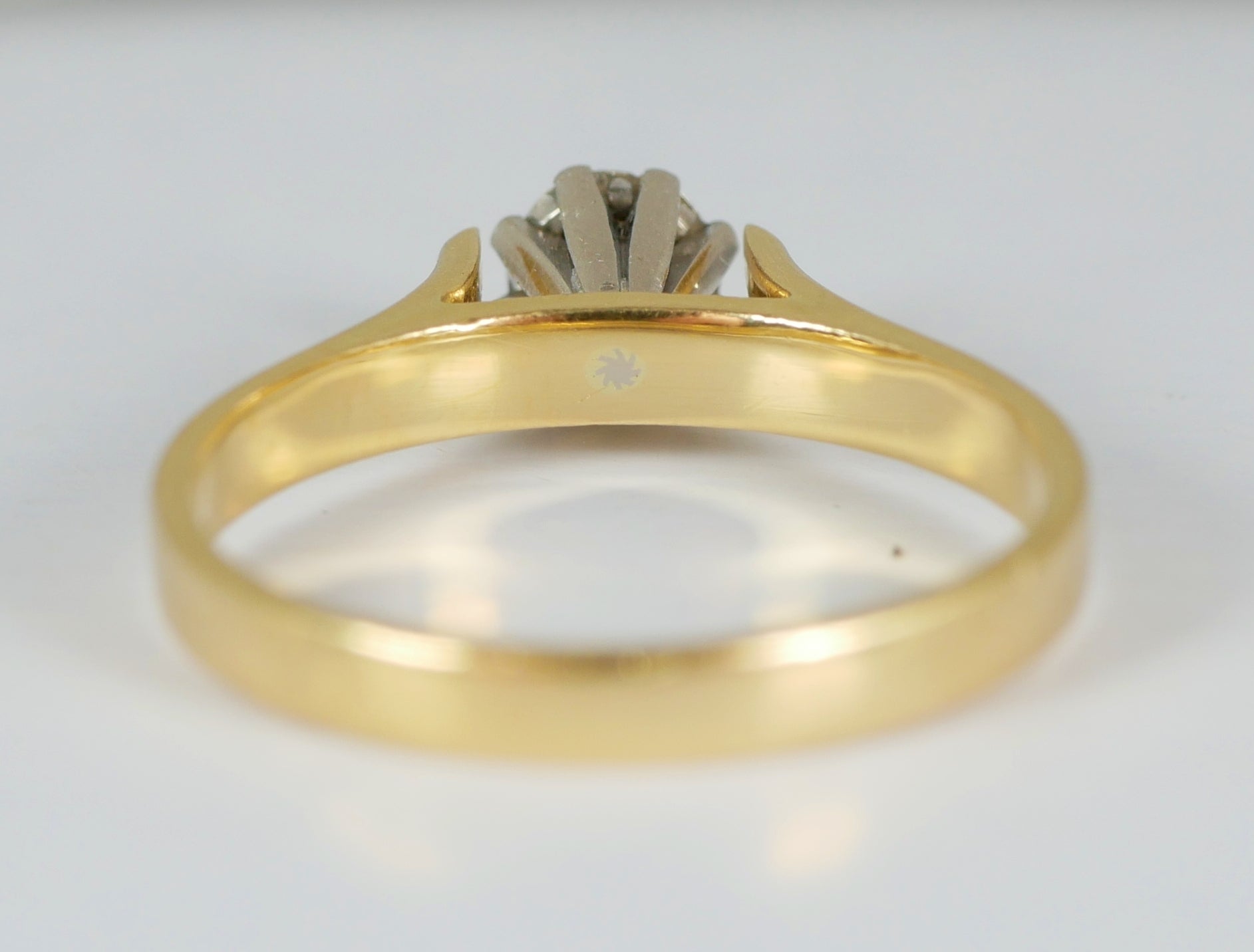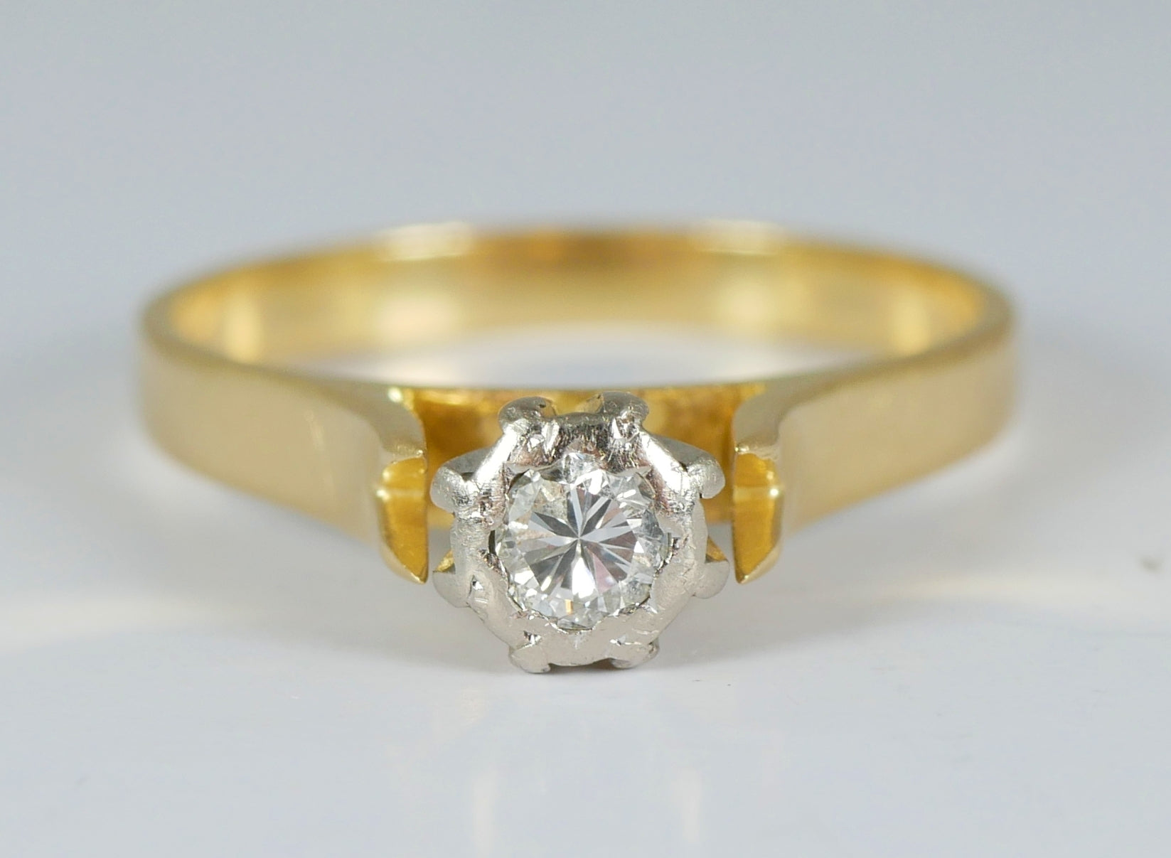 Here today for your consideration we have this lovely vintage solid 15ct yellow gold solitaire ring, featuring a palladium-set genuine diamond. The quality is very good, with the ring without hallmark or engraving (tested and guaranteed as 15ct gold throughout). The diamond has nice clarity with the table free from damage. A very sweet gold and diamond ring for the collection.