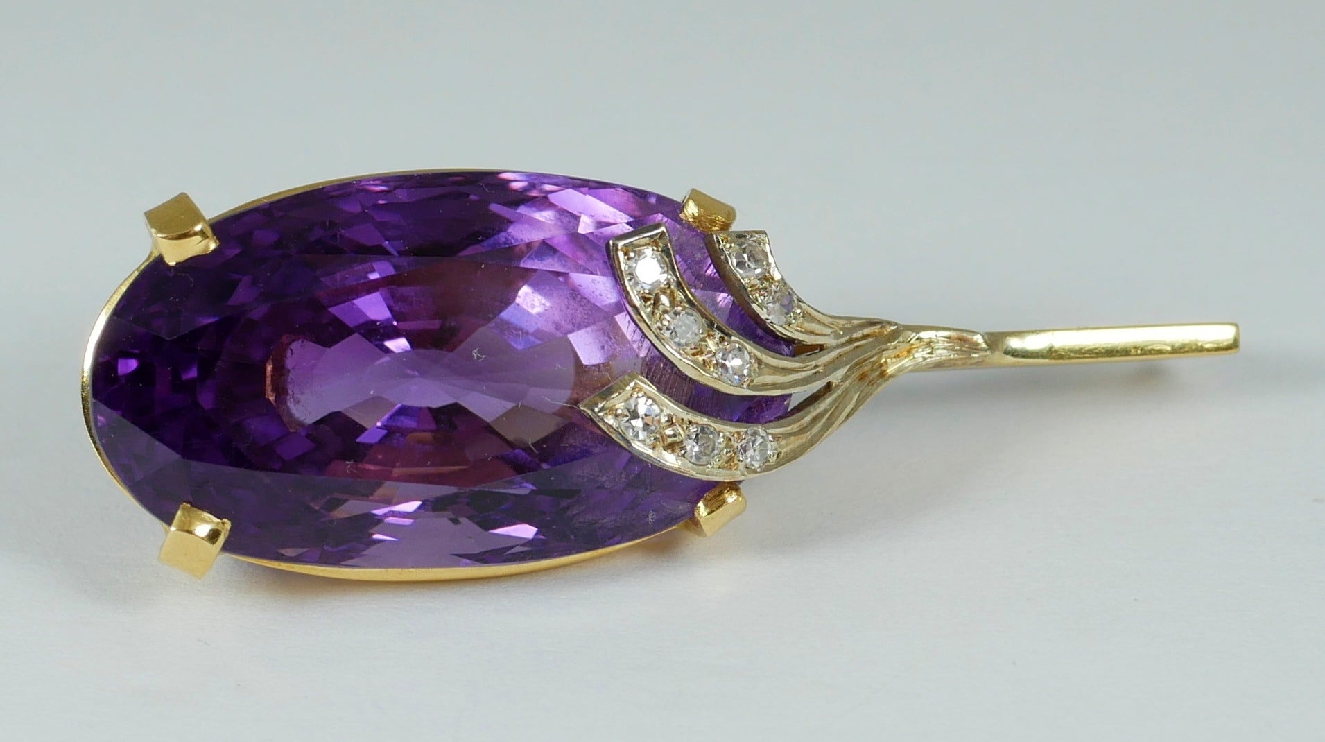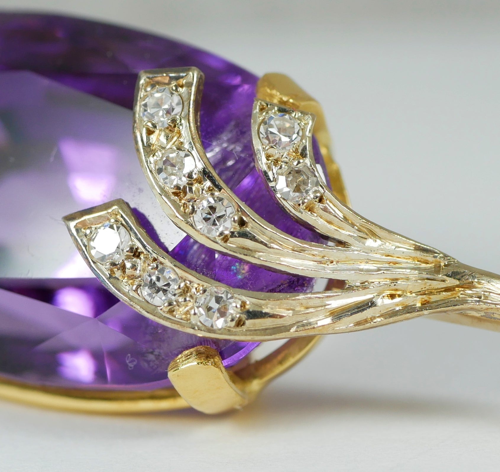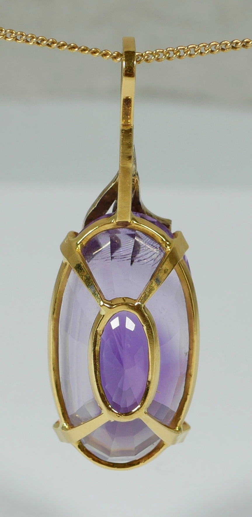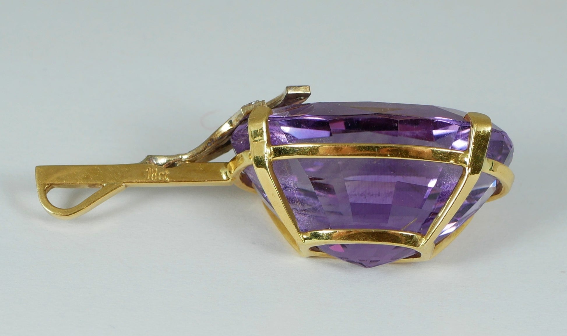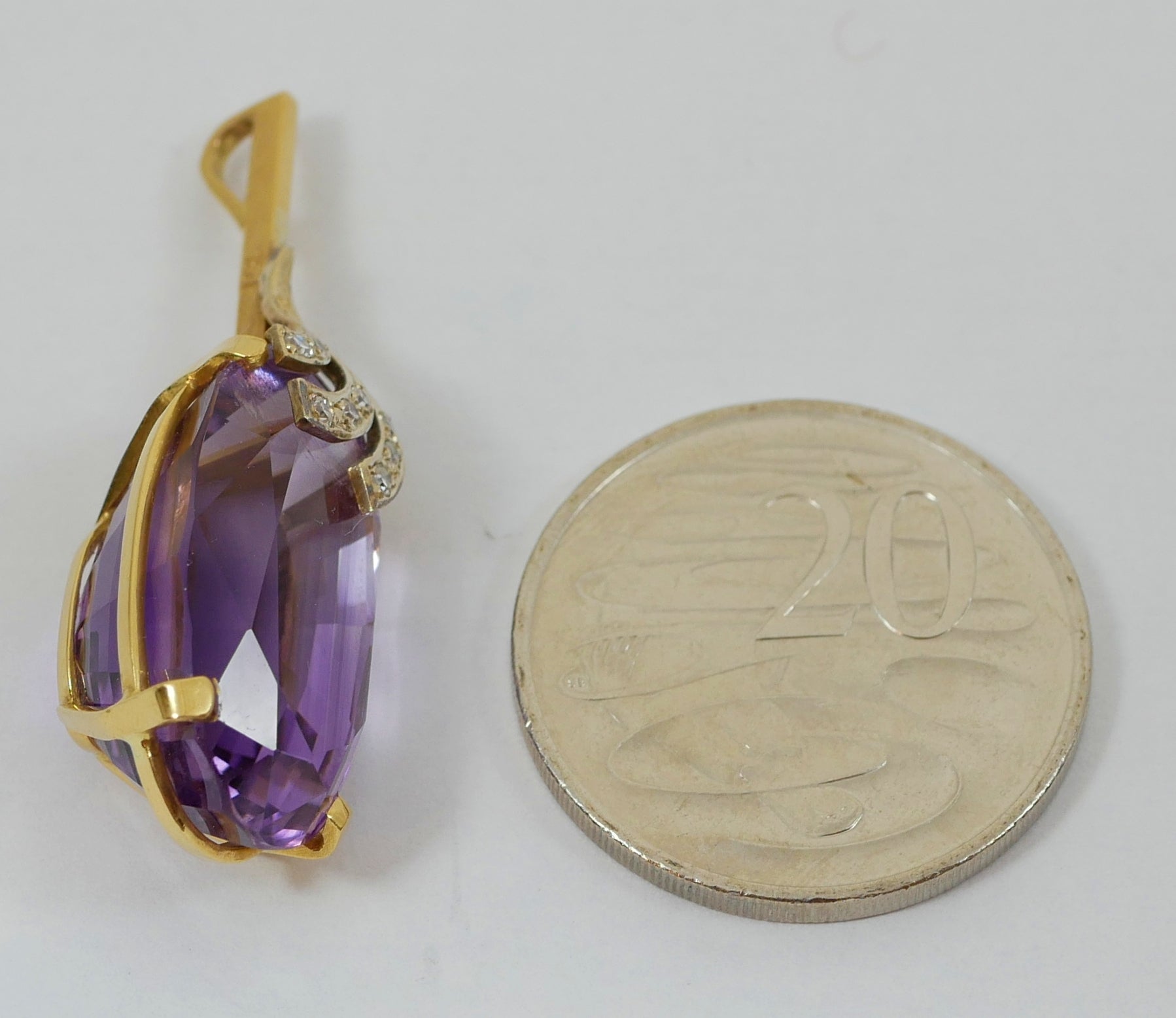 Here today for your consideration we have this fabulous vintage solid 18ct yellow pendant, featuring a large oval-cut amethyst below a spread of eight round-cut genuine diamonds. The pendant is of very good quality and condition throughout, with the setting from damage. The amethyst has some discrete feathering below the applied diamonds, visible only at close inspection (per photos). The pendant is hallmarked to the bail, and has been tested to confirm purity. A fantastic large high carat gold pendant for your collection.