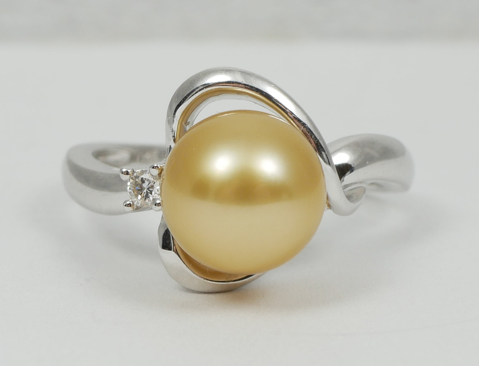Here today for your consideration we have this beautiful contemporary solid 14ct white gold ring, featuring a central round golden South-Sea pearl and a genuine round cut diamond accent stone. The ring is brand new ex-jeweller's stock and is of very good quality throughout. The pearl maintains full lustre, with the white gold without wear or abrasion. An attractive solid gold pearl and diamond ring for the collection.