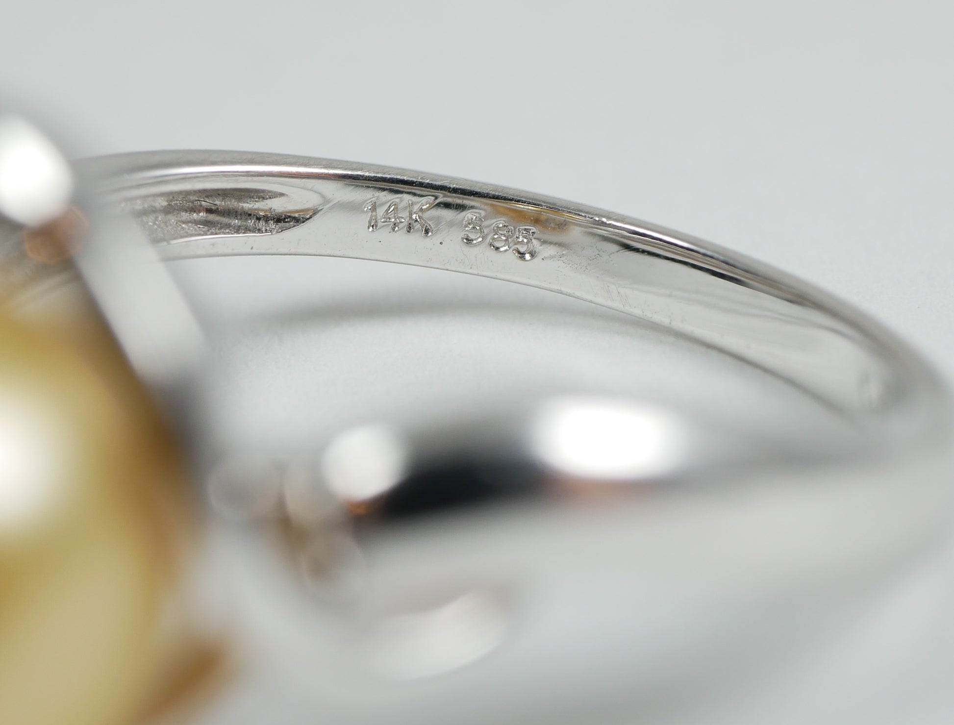 New Solid 14ct White Gold 9mm Golden South Sea Pearl Diamond Dress Ring 7.5 O 55