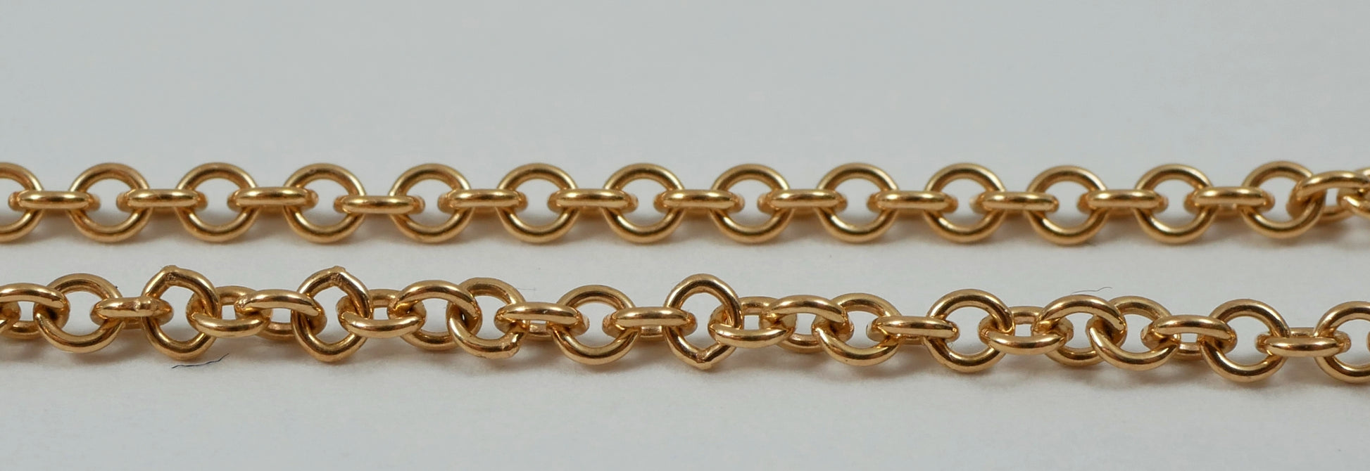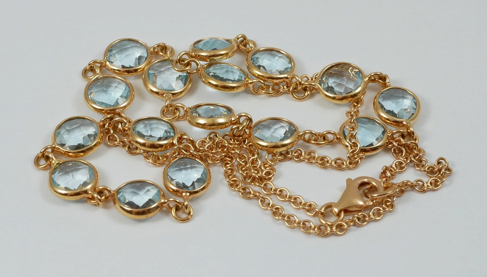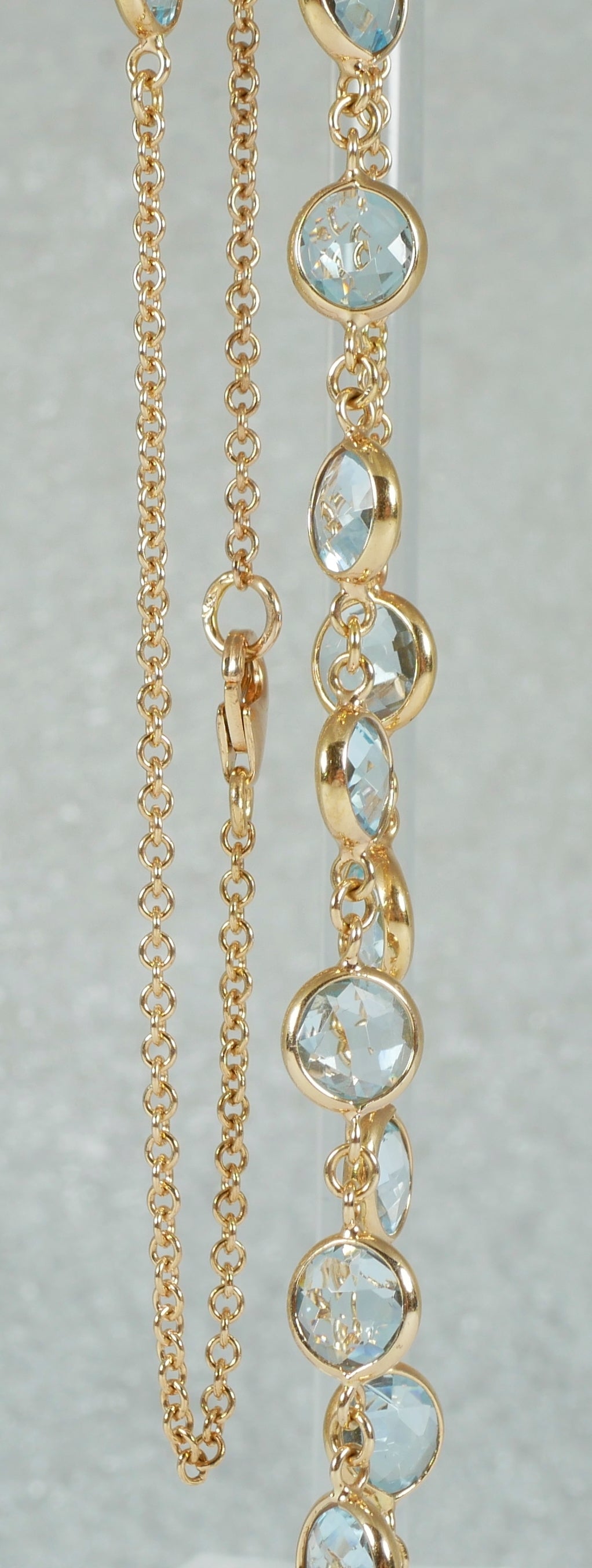 The topaz have diameters of 5mm and have a total estimated weight of 8cts, with the 1.5mm-wide chain measuring 40cm (15.75") long. Unpacked, it weighs in at 8.17gms