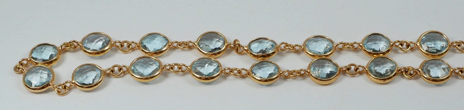 Here today for your consideration we have this beautiful Italian solid 18ct yellow gold necklace, featuring sixteen (16) double-sided round topaz checkerboard cut for maximum sparkle. The chain is in good used condition with no damage to note. The lobster clasp holds good tension, with the chain hallmarked to the clasp and jump ring. The stones are in good order with no table damage, with the links free from wear. An attractive gold and topaz necklace for the collection.