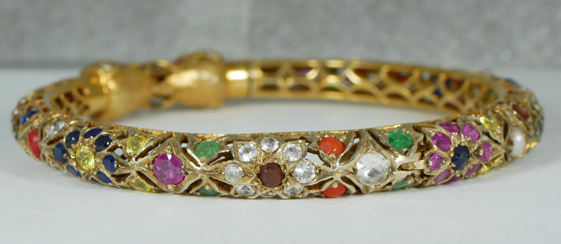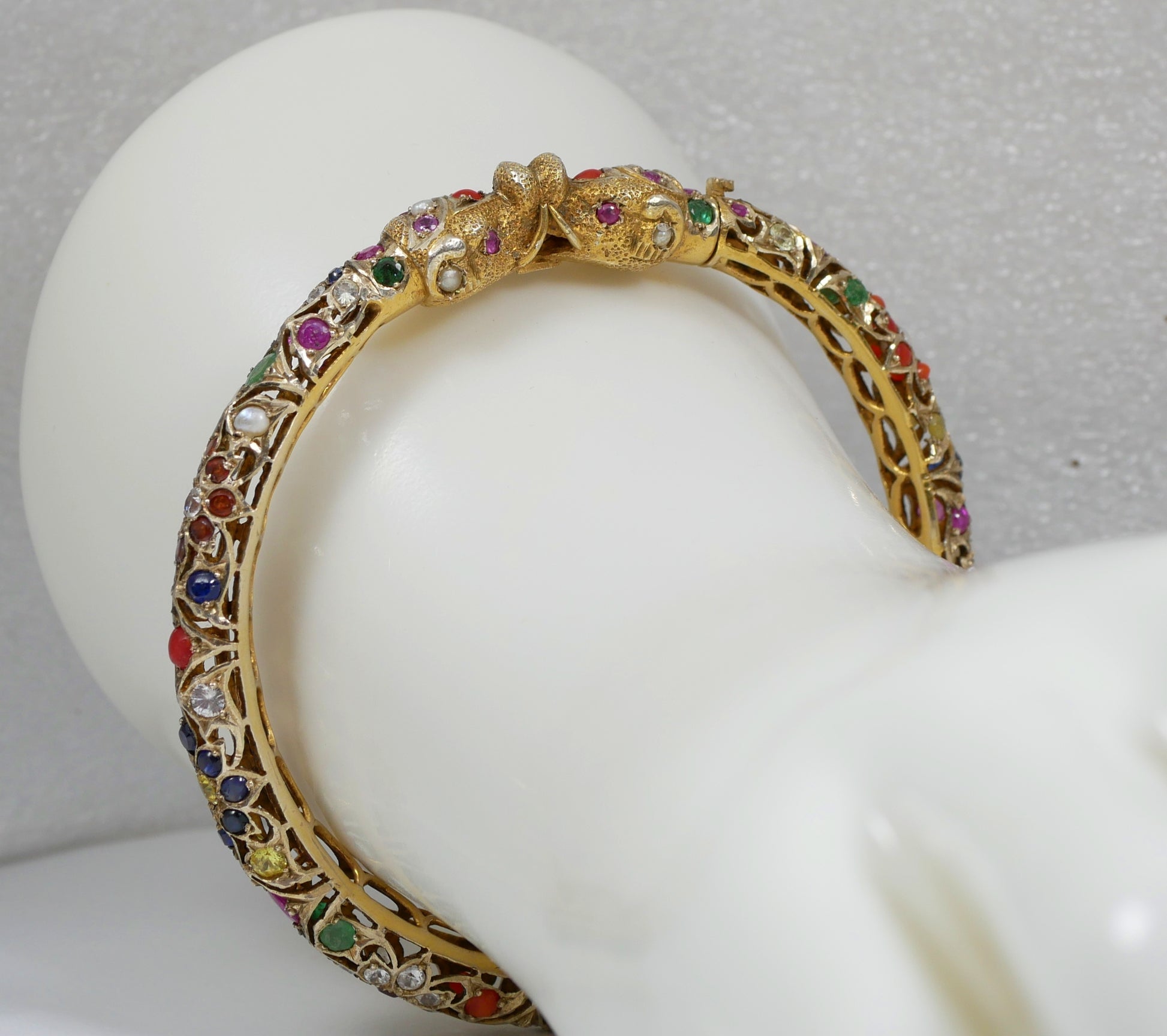 Here today for your consideration we have this fantastic vintage solid 9ct yellow gold bangle, produced in the Mughal style and set with a total of one hundred and thirty-four (134) precious and semi-precious gemstones. The bangle features two meeting elephant heads and includes a wide variety of different gemstones including emeralds, rubies, blue and white sapphires, citrine, seed pearl and coral, being of excellent quality throughout. Condition is good used, with no major damage to note. The gemstones are complete, with the hinge and clasp operating as intended. A delightfully colourful bangle in strong 9ct gold or the collection.