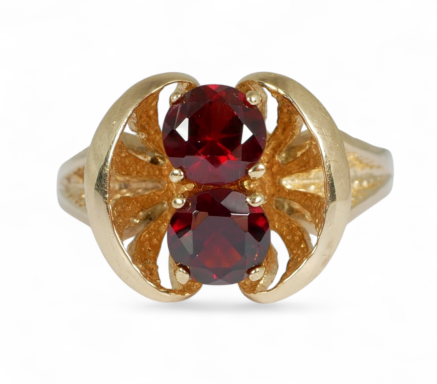 Here today for your consideration we have this fantastic retro solid 9ct yellow gold dress ring, featuring two round-cut garnets in an organic-style textured gold setting. The quality is very good, with the ring hallmarked internally and without engraving (hallmark overstruck; tested and guaranteed 9ct throughout). The garnets are free from table damage, with the claws in good condition. A unique sold gold dress ring for the collection.