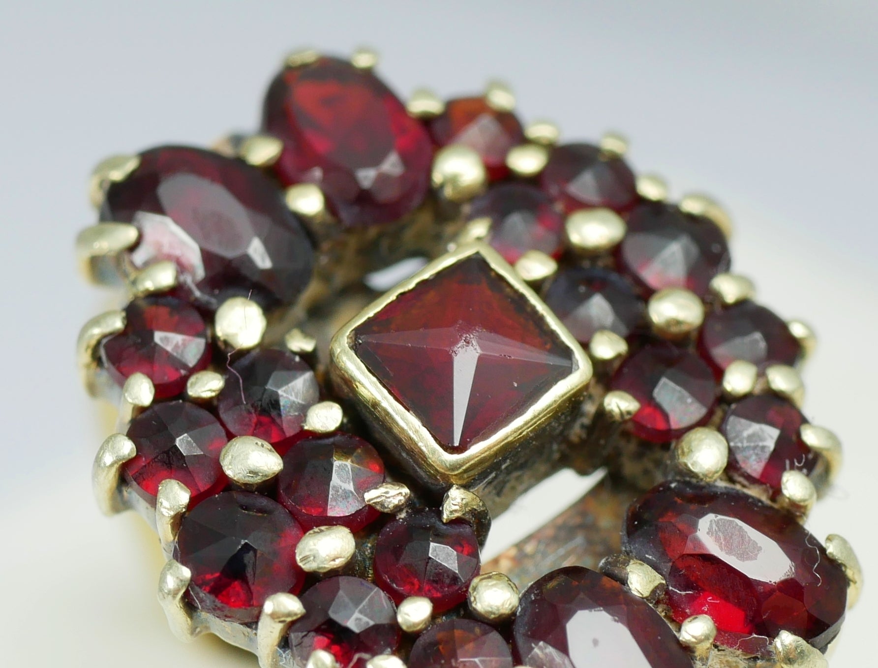 Here today for your consideration we have this charming vintage solid 14ct yellow gold dress ring, featuring a cluster of round, oval and square cut garnets of uniform colour. The quality is good, with the ring hallmarked internally and without engraving. A sweet solid gold cluster ring for the collection.