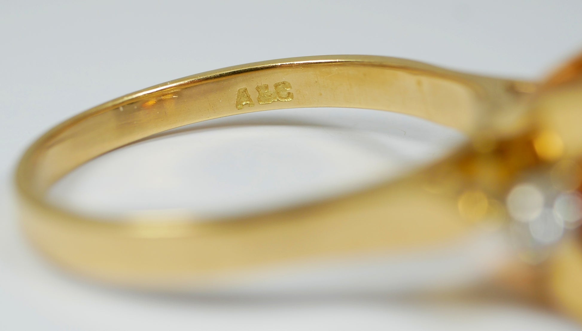 Here today for your consideration we have this beautiful vintage solid 18ct yellow gold three-stone dress ring, featuring an emerald-cut Madeira orange citrine flanked by two palladium-set genuine diamonds as made by Angus & Coote. The quality is very good, with the ring hallmarked internally and without engraving. The citrine is of intense colour with no damage to the table, with the diamonds exuding good radiance. A very nice high carat gold ring from a well respected Australian jeweller.