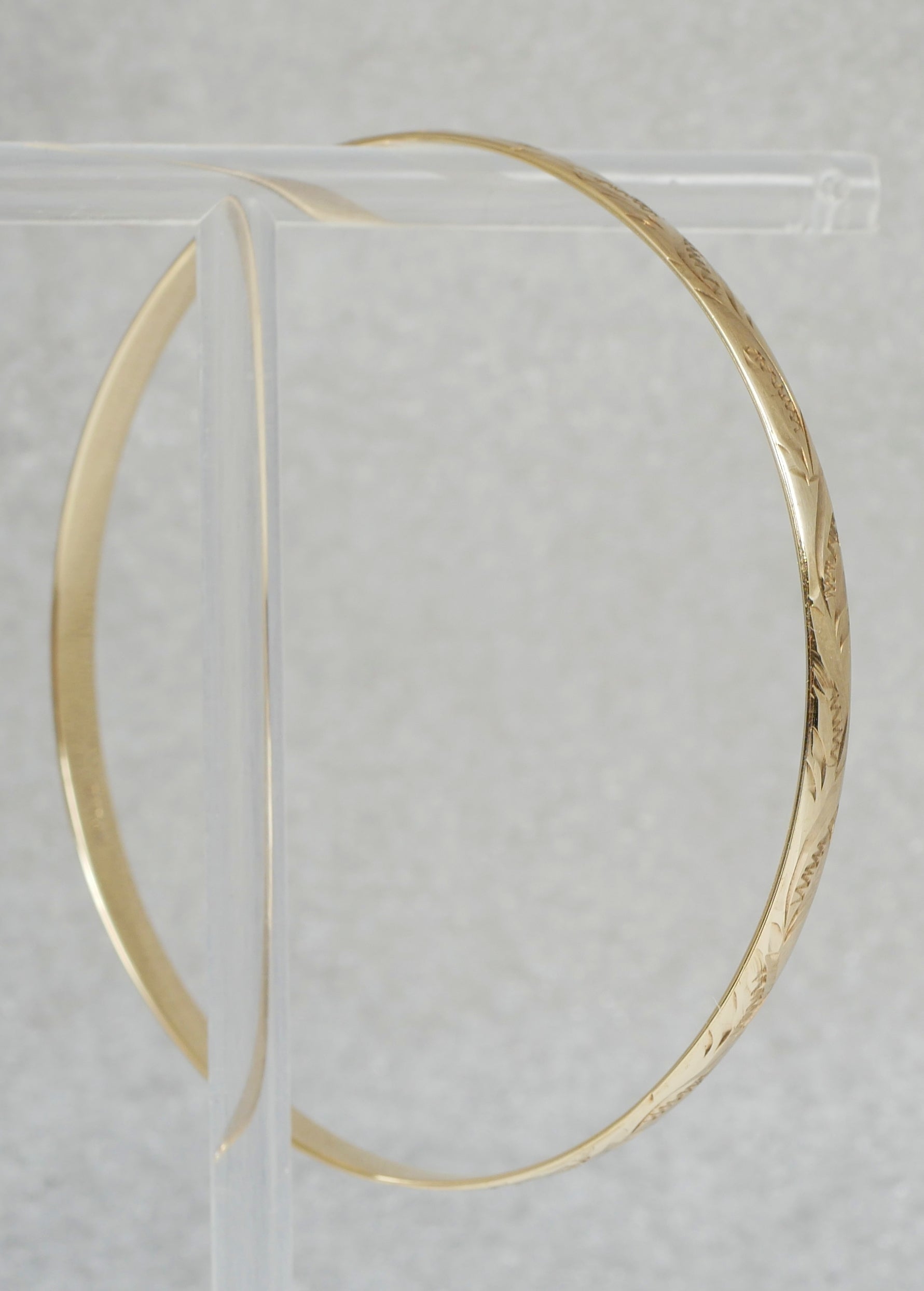 Here today for your consideration we have this lovely vintage solid 9ct yellow gold bangle, being of D profile shape and featuring an all-round repeating bright-cut leaf design. The bangle is solid throughout and is in good used condition with no major damage to note. The hallmarks are well struck to the interior, with the piece free from personal engraving. A good quality solid gold bangle for the collection.